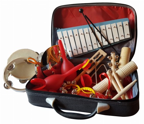 Kompletny, zabawkowy zestaw instrumentów perkusyjnych.