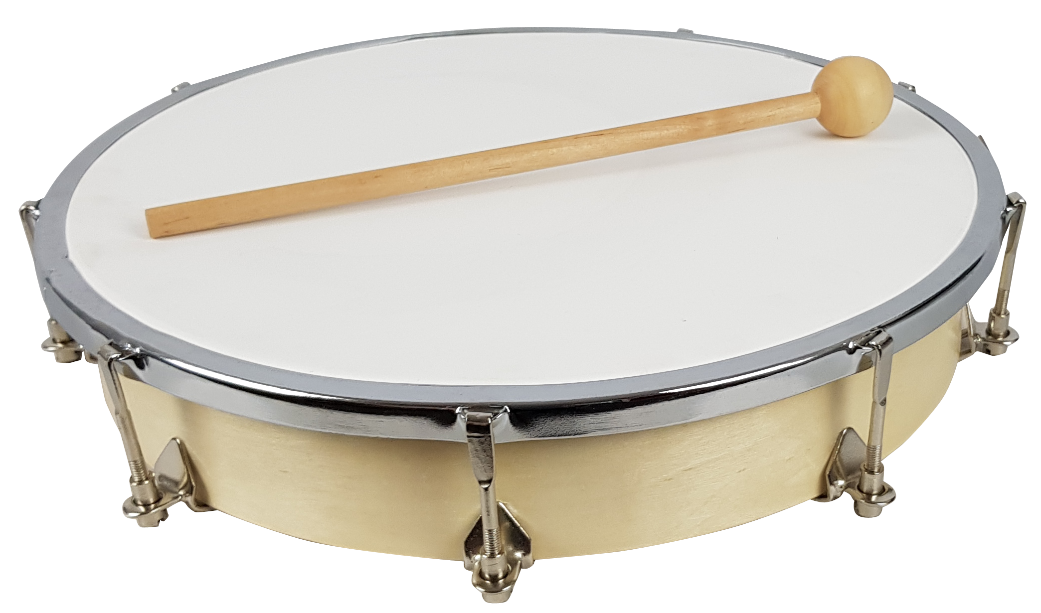 - Chromowana, metalowa obręcz z zestawem 9 śrub naciągowych umożliwiających strojenie membrany