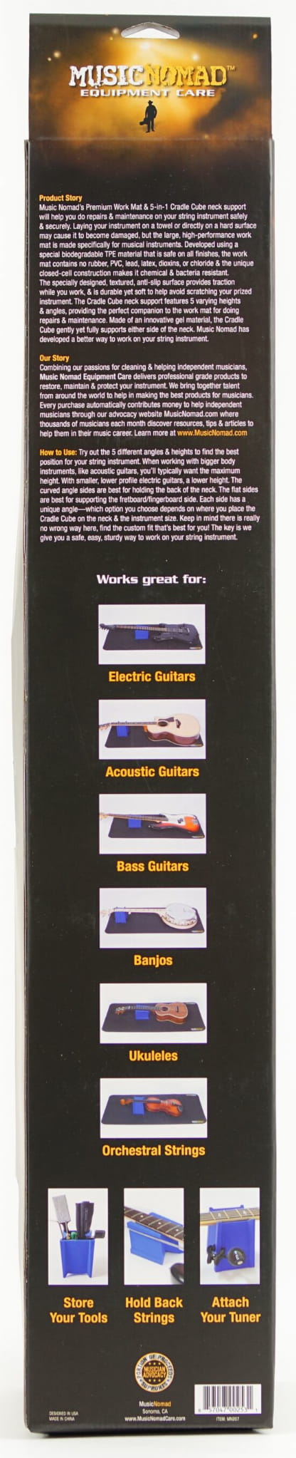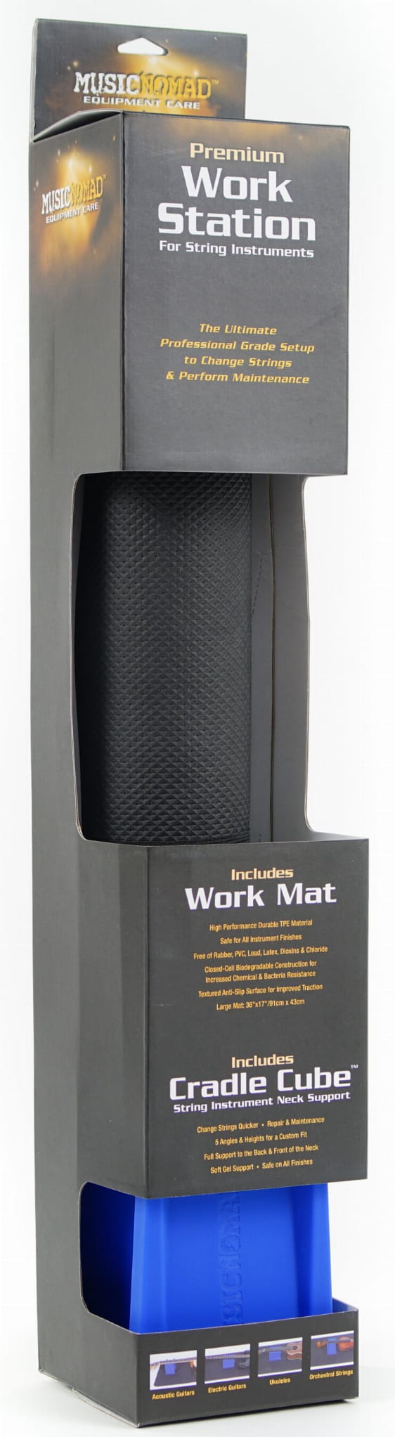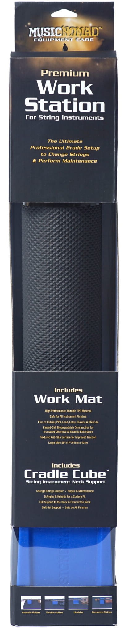 Music Nomad's Premium Work Mat i 5-w-1 Cradle Cube neck pomagają w naprawie i konserwacji instrumentu smyczkowego w bezpieczny sposób. Położenie instrumentu na ręczniku lub bezpośrednio na twardą powierzchnię może spowodować jego uszkodzenie. Z pomocą przychodzi duża, wysokowydajna mata robocza, która