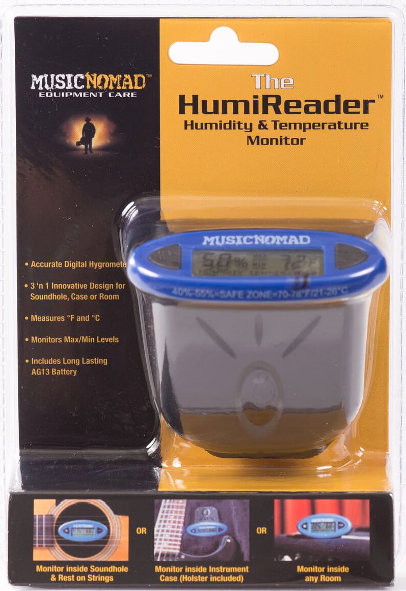 Z HumiReader odpowiednia ochrona twojego instrumentu staje się jeszcze prostsza. Jest to rewolucyjne połączenie higrometru i termometru w jednym urządzeniu, które dodatkowo jest łatwe w użyciu i transporcie. Nadaje się do wszelkiego rodzaju instrumentów strunowych. Monitorowanie temperatury oraz poziomu wilgotności jest kluczowe dla zapewnienia instrumentowi odpowiednich warunków, aby zapobiec przed jego uszkodzeniem. HumiReader pozwala zmierzyć wszystkie te dane w dowolnym miejscu, przy główce, na podstrunnicy lub w otworze rezonansowym.
